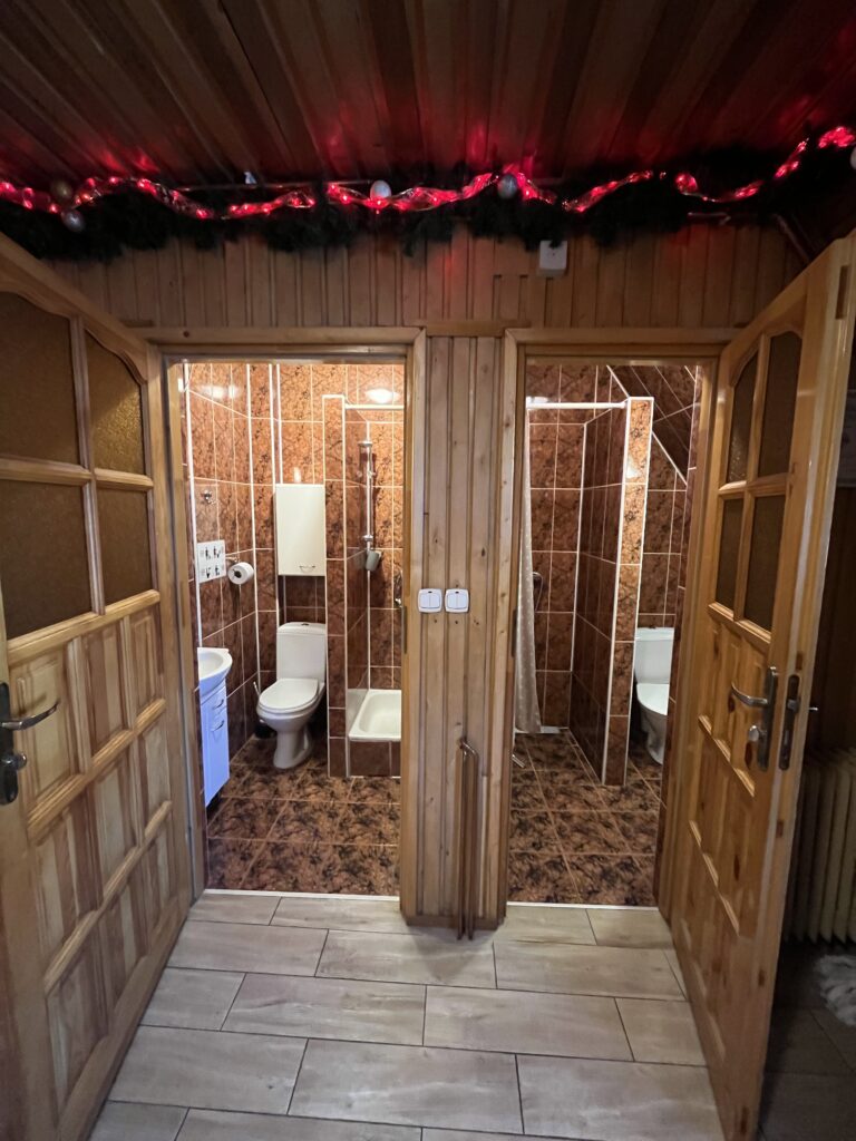 Dla gości dostępne są na I piętrze 2 bliźniacze łazienki zawierające umywalki, prysznice i toalety. Jest również na parterze 2 pary drzwi: z oddzielnym prysznicem i lustrem oraz drugie drzwi z oddzielną toaletą i umywalką.